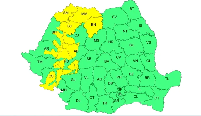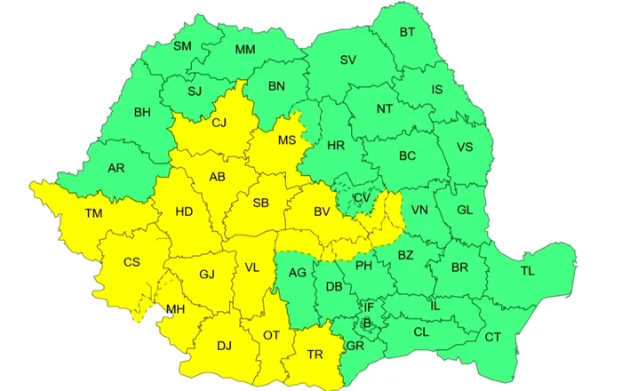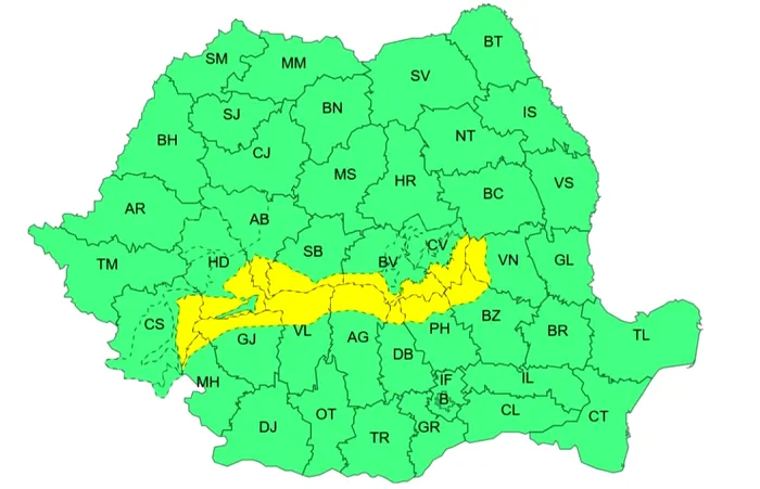 Meteorologii au emis o avertizare Cod galben pentru zona montană și submontană a județelor Caraș-Severin, Hunedoara, Timiș, Arad, Alba, Bihor, Satu Mare, Sălaj, Maramureș, Cluj și Bistrița-Năsăud. În aceste zone, temporar vor fi precipitații însemnate cantitativ și se vor acumula 20…30 l/mp. Vor fi ploi ce vor avea și caracter de aversă, iar la altitudini în general de peste 1400 m, vor predomina ninsorile și se va depune strat de zăpadă de 10…25 cm. În zona montană înaltă a Carpaților Occidentali, precum și în cea din nordul Carpaților Orientali și vestul Carpaților Meridionali vântul va prezenta intensificări cu viteze de 60…90 km/h, astfel va fi viscol, iar vizibilitatea va scădea sub 100 m.