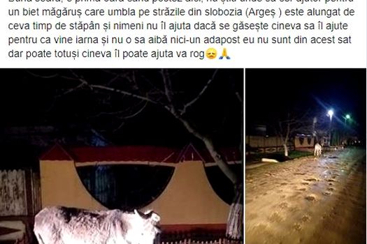 „Bună seara, e prima oară când postez aici, nu ştiu unde să cer ajutor pentru un biet măgăruş care umblă pe străzile din Slobozia (Argeş). Este alungat de ceva timp de stăpân şi nimeni nu îl ajuta. Dacă se găseşte cineva sa îl ajute pentru că vine iarna şi nu o să aibă niciun adăpost. Eu nu sunt din acest sat, dar poate totuşi cineva îl poate ajuta, vă rog”, a scris femeia.