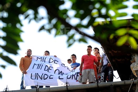 Câţiva dintre ei s-au urcat pe acoperişul unei dintre case cu o pânză pe care scrie „Mii de case goale, mii de oameni în stradă. Unde e dreptatea?”.