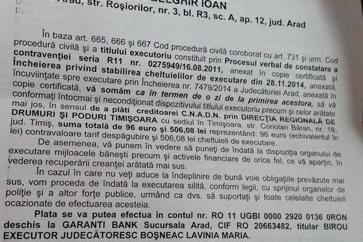 Somaţia primită de la CNADNR îi este adresată persoanei decedate, iar din document reiese că trebuie achitate amenda de 96 de euro şi cheltuielile de executare silită, în sumă de 506 lei.