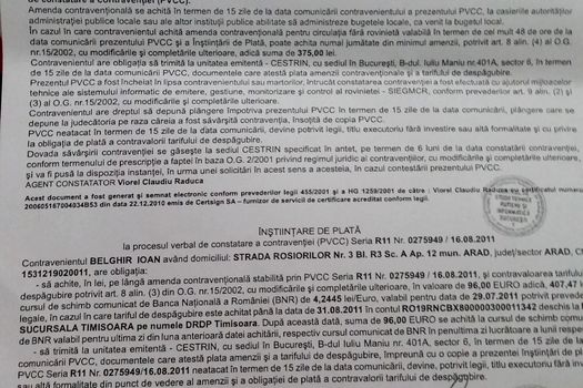 „În august 2011, a fost emis şi procesul de constatare a contravenţiei, iar pentru că tata nu a mai fost găsit acasă, fiind mort, s-a intrat în procedurile de executare silită. Ne-am trezit zilele trecute cu somaţie, tot pe adresa tatălui meu, că va fi executat silit cu jandarmii”, a declarat, joi, corespondentului MEDIAFAX, fiica celui decedat, Izabela Belghir.