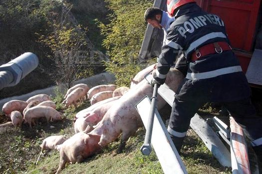 La faţa locului s-au deplasat pompierii militari care au intervenit pentru stingerea focului, dar şi pentru îndepărtarea porcilor de pe carosabil.