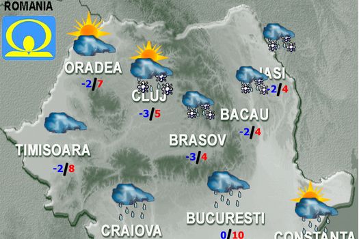 În vestul, centrul şi nordul ţării, cerul va avea înnorări şi, mai ales în cursul zilei, local vor fi precipitaţii slabe, mai ales sub formă de lapoviţă şi ninsoare, iar la munte va ninge. În restul teritoriului, cerul va fi variabil, cu unele înnorări în primele ore în regiunile sudice, unde, precipitaţii slabe, mixte se vor mai semnala doar izolat. Vântul va sufla slab şi moderat, cu unele intensificări în Dobrogea, Moldova, Banat şi în zona montană înaltă. Temperaturile maxime vor fi cuprinse între 1 grad în estul Transilvaniei şi în Dealurile de Vest şi 9 grade în Oltenia, iar cele minime se vor situa, în general, între -8 şi 0 grade.