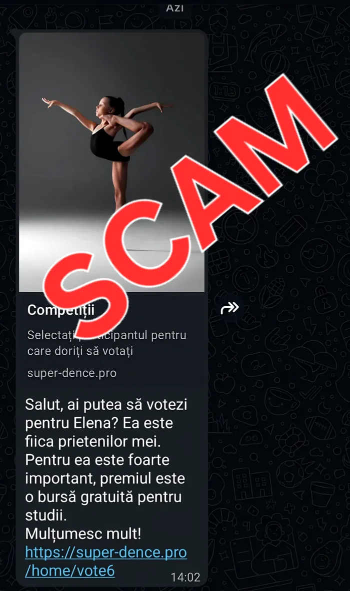 Directoratul Național de Securitate Cibernetică (DNSC) explică faptul că schema pornește de la un mesaj trimis pe telefon, în care atacatorii solicită „un vot” pentru presupusa fetiță a unei prietene, atașând un link către un site fals.