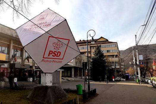 Mai multe mesaje sub sigla PSD au apărut, joi, pe un cub amplasat în centrul oraşului Piatra-Neamţ.