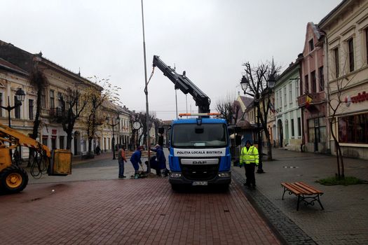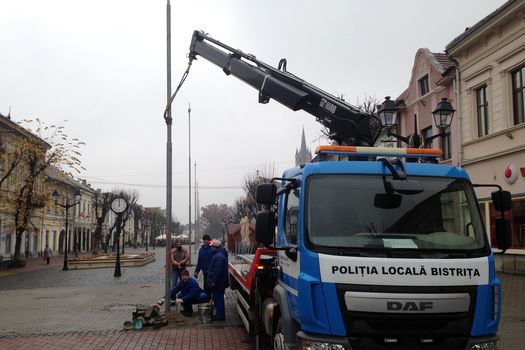 În tot acest timp, autospeciala de ridicări auto, destinată Poliţiei Locale Bistriţa, este folosită pentru diverse alte activităţi, cum ar fi, de exemplu, transportul şi montarea unor stâlpi de mari dimensiuni care să susţină o cupolă luminoasă pe care Primăria Bistriţa a achiziţionat-o anul acesta pentru completarea iluminatului festiv de sărbători.