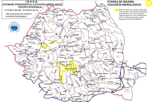 În urma precipitaţiilor însemnate cantitativ din ultimele 24 de ore, a fost instituit codul galben de inundaţii pe râurile din bazinele hidrografice superioare ale Crişului Alb (judeţele Hunedoara şi Arad) şi Arieşului (judeţul Alba). Avertizarea emisă pentru aceste râuri este valabilă până joi, la ora 20.00.