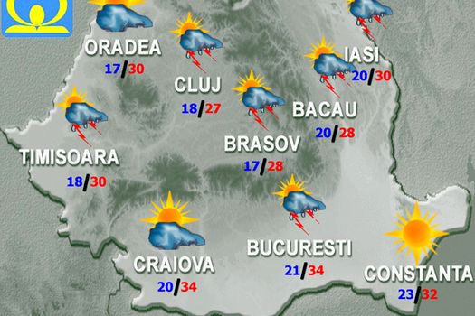 În majoritatea regiunilor instabilitatea atmosferică va fi accentuată şi se va manifesta prin înnorări, averse, descărcări electrice şi intensificări de scurtă durată ale vântului. Izolat cantităţile de apă vor fi însemnate şi vor fi condiţii de grindină. Excepţie vor face estul şi sud-estul ţării, unde vremea va deveni călduroasă, local caniculară după-amiaza, cerul va fi variabil, iar fenomenele de instabilitate atmosferică vor fi posibile doar izolat. Temperaturile maxime vor fi cuprinse între 26 de grade în nordul extrem şi în depresiuni şi 35 de grade în est, iar cele minime se vor situa între 11 grade în depresiuni şi 25 de grade în Delta Dunării.