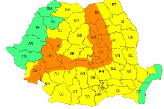 Sunt vizate de Codul portocaliu judeţele Alba, Hunedoara, Caraş-Severin, Mehedinţi, Dolj, Sibiu, Vâlcea, Braşov, Argeş, Dâmboviţa, Prahova, Buzău, Vrancea, Covasna, Bacău, Harghita, Neamţ şi Suceava.