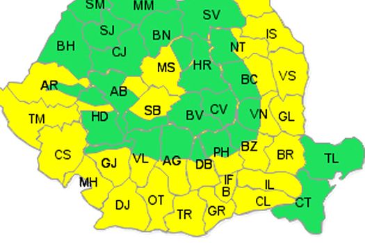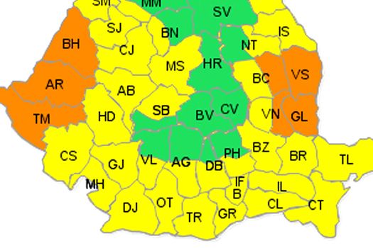 Sâmbătă, judeţele Bihor, Arad, Timiş, Vaslui Galaţi şi, parţial, Bacău şi Vrancea vor fi sub COD PORTOCALIU de caniculă, iar Capitala şi restul judeţelor, cu excepţia Sucevei, Harghitei, Covasnei şi Braşovului, vor fi total sau parţial sub cod galben. Temperaturile maxime se vor situa în jurul valorii de 38 de grade, iar disconfortul termic va fi deosebit de accentuat.