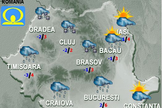 Vineri, vremea va fi în general închisă, iar aria precipitaţiilor se va extinde dinspre vest, cuprizând treptat toate regiunile. La început acestea vor fi mai frecvente şi mai însemnate cantitativ în jumătatea de vest a ţării, apoi se vor semnala local şi în restul teritoriului, unde vor fi în general slabe. În zonele montane va ninge, în Banat, Oltenia şi Crişana la început vor predomina ploile, apoi vor fi precipitaţii mixte, iar în Maramureş şi Transilvania vor fi mai ales lapoviţe şi ninsori. Cantităţile de apă vor totaliza 15…20 l/mp în regiunile sud-vestice, dar cu precădere la munte unde se va depune strat nou de zăpadă, local mai consistent. În Muntenia şi Dobrogea va ploua pe spaţii extinse, iar în Moldova precipitaţiile, predominant ploi, se vor semnala pe arii restrânse. Trecător şi izolat vor fi condiţii de polei. Vântul va avea intensificări pe crestele montane, cu rafale ce vor depăşi 70…80 km/h, viscolind şi spulberând ninsoarea, dar temporar şi în sud-vestul şi estul ţării, unde vitezele vor atinge 50…60 km/h. Temperaturile maxime se vor încadra între 1 grad, izolat, în Oltenia, Maramureş, nordul şi estul Transilvaniei şi nordul Moldovei şi 9 grade în Dobrogea, iar cele minime vor fi cuprinse între -4 şi 6 grade.