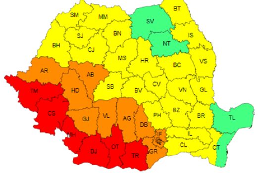 Va fi Cod roşu în judeţele Timiş, Caraş-Severin, Mehedinţi, Dolj, Olt şi Teleorman. Temperaturile maxime vor fi de 38…39 de grade şi izolat de 40 de grade. Va fi caniculă şi disconfort termic deosebit de accentuat, iar indicele temperatură-umezeală (ITU) va depăşi pragul critic de 80 de unităţi. Minimele se vor situa în jurul a 23 de grade (noapte tropicală), izolat de până la 26 de grade în Dealurile de Vest.
