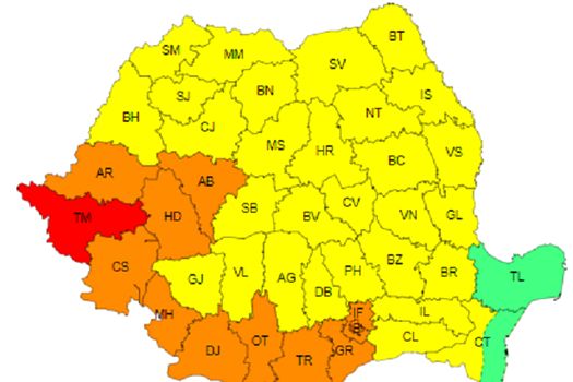 Pentru duminică, meteorologii anunţă Cod roşu de caniculă în judeţul Timiş, unde maximele vor fi de 38-39 de grade. De asemenea, valul de căldură va persista în sudul Banatului şi al Crişanei, sud-vestul Transilvaniei, vestul şi sudul Olteniei, sud-vestul şi centrul Munteniei, care vor fi sub avertizare Cod portocaliu. Va fi caniculă şi disconfort termic accentuat, iar indicele temperatură-umezeală (ITU) va depăşi pragul critic de 80 de unităţi. Temperaturile maxime vor fi în general de 37…38 de grade. Minimele, de 19…25 de grade, local vor caracteriza o noapte tropicală.