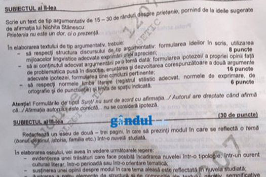 A doua cerinţă era de realizat un text argumentativ despre prietenie, pornind de la afirmaţia lui Nichita Stănescu: „Prietenia nu este un dor ci o prezenţă”.