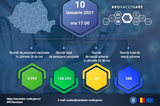 Număr de reacţii adverse înregistrate la nivelul centrelor de vaccinare, începând din 27 decembrie 2020, este de388 comune şi minore, dintre care 155 reacţii locale cu durere la locul injectării şi 233 reacţii generale (febră, cefalee, mialgii, artralgii, astenie, alergii de tip urticarie).