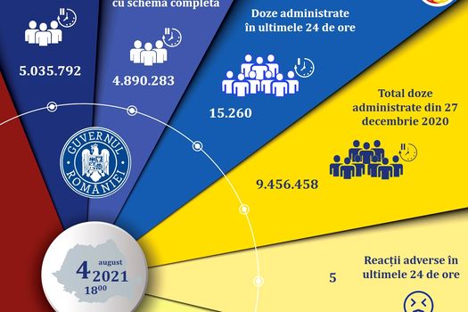 De la începutul campaniei, în România au fost vaccinate 5.035.792 de persoane, din care 4.890.283 cu ambele doze.