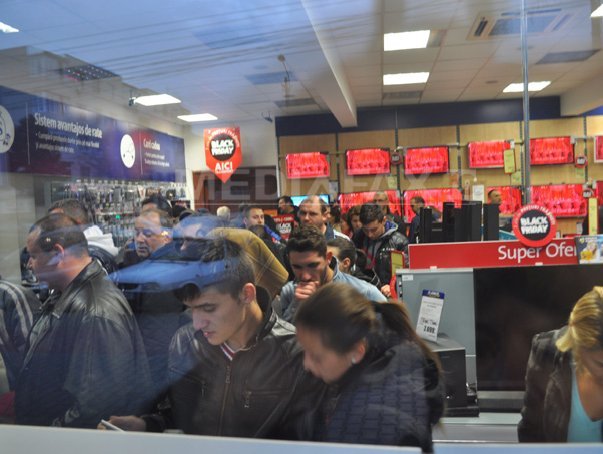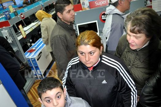 Vineri, începând cu ora 5.00, în faţa magazinului s-au format cozi, oamenii încercând să ţină o evidenţă a celor care au ajuns primii. Odată intraţi în magazin, însă, au pierdut evidenţa şi s-au grăbit să pună mâna pe produse ieftine: televizoare, tablete, telefoane, jocuri, monitoare.