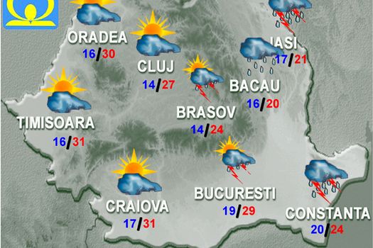 Vremea se menţine caniculară în sudul şi sud-estul ţării, iar indicele temperatură-umezeală va atinge şi depăşi pragul de 80 al disconfortului termic în Oltenia, Muntenia, Dobrogea şi sudul Moldovei. În restul teritoriului, cu precădere în vest, temperatura aerului va marca o scădere considerabilă faţă de ziua precedentă. Cerul va prezenta înnorări temporar accentuate în prima parte a zilei în regiunile intracarpatice, unde local vor fi ploi în general slabe. Mai ales spre seară şi noaptea instabilitatea atmosferică se va accentua în sudul, centrul şi estul ţării, unde vor fi averse, însoţite de descărcări electrice şi izolat de grindină, iar pe arii restrânse cantităţile de apă vor depăşi 25 l/mp. Vântul va prezenta intensificări temporare în majoritatea zonelor, dar şi în timpul ploilor când poate lua aspect de vijelie. Temperaturile maxime vor fi cuprinse între 27…28 de grade în Dealurile de Vest şi Maramureş şi 38…40 de grade în Oltenia şi Muntenia. Minimele termice se vor încadra între 15 şi 23 de grade.