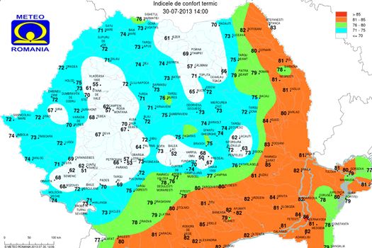 Disconfortul termic este deosebit de accentuat, iar indicele temperatură-umezeală (ITU) se va situa peste pragul critic de 80 de unităţi.