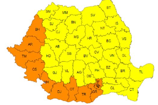 Judeţele Bihor, Arad, Timiş, Caraş-Severin, Mehedinţi, Dolj, Olt, Teleorman, Giurgiu, Ilfov şi Bucureştiul sunt sub Cod portocaliu de caniculă.