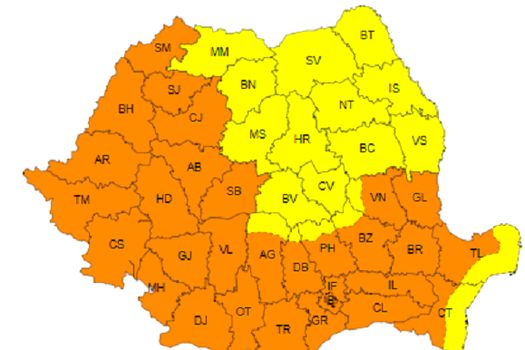 Judeţele Satu Mare, Sălaj, Prahova, Dâmboviţa, Argeş, Vâlcea, Dolj, Mehedinţi, Gorj, Sibiu, Alba, Cluj, Bihor, Arad, Timiş, Caraş Severin, Hunedoara, Vrancea, Galaţi, Buzău, Brăila, Tulcea, Ialomiţa, Constanţa, Ilfov, Călăraşi, Giurgiu, Teleorman, Olt şi Capitala intră însă sub avertizare Cod portocaliu.
