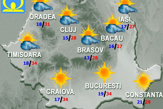 Vremea va fi în general frumoasă, dar şi călduroasă în cea mai mare parte a ţării. Temperaturile maxime vor fi cuprinse între 24 de grade în nordul Moldovei şi 35…36 de grade în Oltenia, sudul Banatul şi al Munteniei. Cerul va fi variabil, mai mult senin dimineaţa dar cu unele înnorări şi izolat ploi slabe, posibil însoţite de descărcări electrice, în partea a doua a zilei în Moldova şi nordul Carpaţilor Orientali, iar seara şi noaptea în nordul şi estul teritoriului precum şi la munte. Vântul va sufla slab şi moderat, cu unele intensificări pe crestele montane. Temperaturile minime se vor situa între 12 şi 22 de grade, mai scăzute în depresiuni, spre 9 grade.