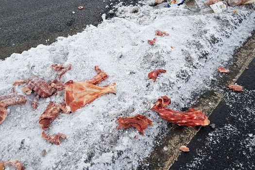 Mai multe bucăţi mari de carne de porc, dar şi multe alte resturi s-au putut observa luni, la intersecţia Drumului European 70 cu Centura Alexandriei. Şoferii s-au arătat extrem de miraţi de eveniment, însă asta nu i-a determinat să facă vreo sesizare la Poliţie.