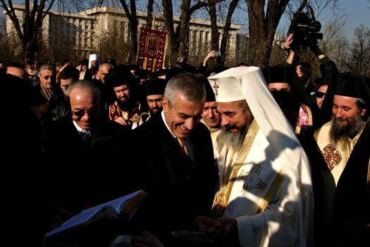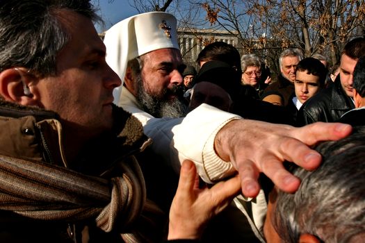 Prea Fericitul Parinte Daniel, Patriarhul Bisericii Ortodoxe Romane, binecuvanteaza un enorias, dupa slujba de sfintire a locului destinat construirii Catedralei Patriarhale, joi, 29 noiembrie 2007, in Bucuresti. ANDREI PUNGOVSCHI / MEDIAFAX FOTO