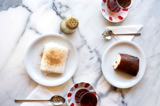 Datând din epoca otomană, „kazandibi” (budinca de lapte caramelizat) are o consistenţă moale şi o bază uşor arsă. Numele desertului se referă la fundul ars al cazanului în care este preparat. Kazandibi se face prin arderea stratului inferior de „tavuk göğsü” (budincă de piept de pui), desertul făcut cu piept de pui mărunţit. Cu toate acestea, majoritatea acestor preparate se servesc cu unt, lapte, făină de orez, zahăr şi amidon, cu partea caramelizată deasupra, fără piept de pui mărunţit. Acest fel de mâncare tradiţională este servită cu cafea sau ceai turcesc la fel ca nenumărate alte deserturi turceşti.