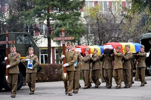 Duminică, pe platoul din incinta Academiei Forţelor Terestre din Sibiu au fost pregătite opt mese îmbrăcate în pânză neagră, pe care să fie aşezate sicriele, transmite corespondentul MEDIAFAX.