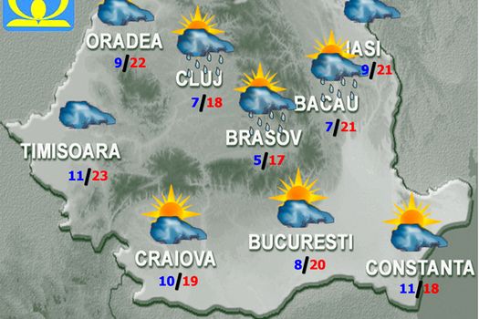 Temperaturile maxime vor avea valori de la 14…15 grade în estul Transilvaniei, până la 24 de grade în Banat, iar cele minime se vor încadra, în general, între 3 şi 13 grade.