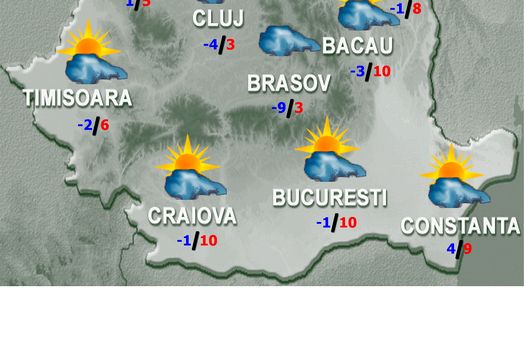 Cerul va fi variabil, iar dimineaţa şi noaptea vor fi condiţii de ceaţă. Vântul va sufla slab până la moderat. Temperatura maximă va fi de 9…10 grade, iar cea minimă de -1 grad, mai scăzută în zona preorăşenească spre -3 grade.