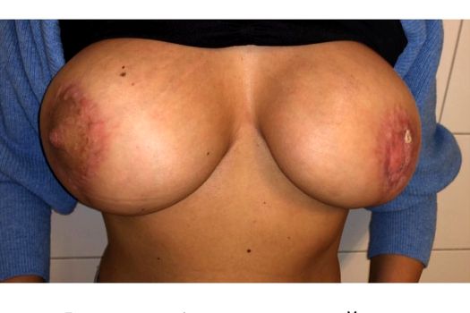 „Pe lângă rezultatul dezastruos estetic pe care îl are, are încă şi o complicaţie locală, care se numeşte necroză de areolă. Practic, în urma actului chirurgical, se întrerupe vascularizaţia zonei pigmentare a sânului, determinând la nivelul acesteia, o zonă cicatricială, mutilantă, extrem de greu de rezolvat chirurgical într-un timp ulterior. Se recomandă să se aştepte până la un an de zile şi atunci se vor încerca nişte manevre chirurgicale de reconstrucţie a acetei zone. Dacă nu, vom încerca printr-un tatuaj să remediem situaţia local”, a spus doctorul Radu Ionescu.