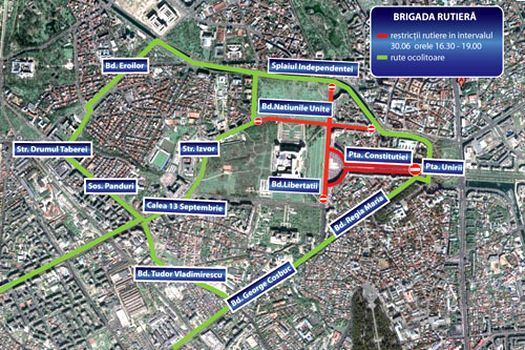 Între orele 16.30 şi 19.00, traficul rutier va fi restricţionat pe Bulevardul Libertăţii, între Calea 13 Septembrie şi Splaiul Independenţei, pe Bulevardul Unirii, între Bulevardul I.C. Brătianu şi Piaţa Constituţiei, precum şi pe Bulevardul Naţiunile Unite, între strada Haşdeu şi Piaţa Naţiunile Unite, potrivit Brigăzii Rutiere a Capitalei.