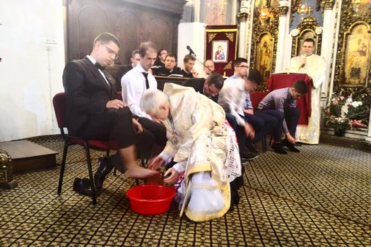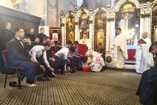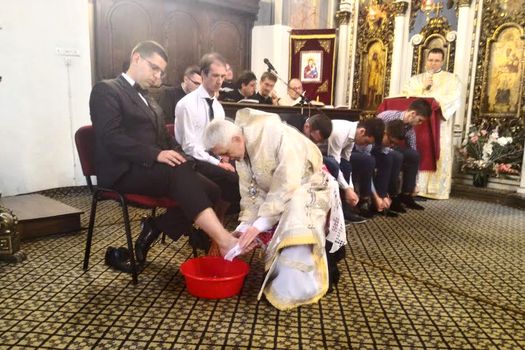 Ceremonia a avut loc, joi, în faţa altarului Catedralei Greco-Catolice „Schimbarea la Faţă” din Cluj-Napoca, unde episcopul Florentin Crihălmeanu a spălat cu apă dintr-un lighean picioarele a 12 seminarişti de la Institutul Teologic „Sf. Ion Evanghelistul” Cluj-Napoca, după care le-a şters cu un prosop şi le-a sărutat.