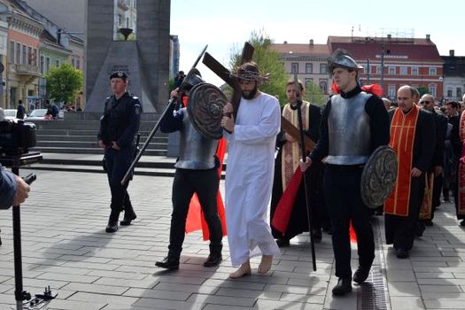 Peste 100 de persoane au participat, miercuri, în centrul municipiului Cluj-Napoca, la procesiunea "Calea Crucii a Milostivirii”, organizată de Episcopia Română Unită, Greco-Catolică de Cluj-Gherla, având în faţă un tânăr care purta o cruce de lemn pe umăr şi o coroană de spini pe cap.