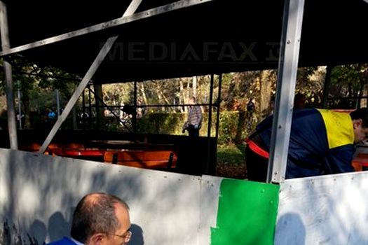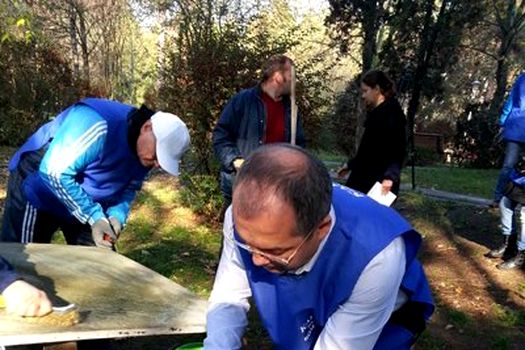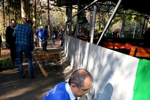 Primarul a început prin a curăţa cu un burete şi soluţie specială un aparat de joacă pentru copii, după care a trecut la răzuirea cu un şpaclu a vopselei de pe un scaun de lemn din parc şi a continuat vopsind în verde un foişor şi măturând frunzele uscate.