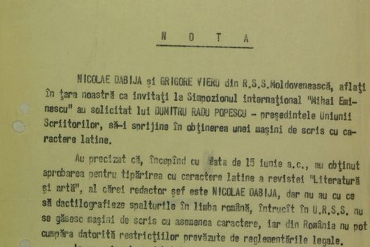 „Nicolae Dabija și Grigore Vieru din R.S.S. Moldovenească, aflaţi în ţara noastră ca invitaţi la Simpozionul Internațional «Mihai Eminescu», au solicitat lui Dumitru Radu Popescu – preşedintele Uniunii Scriitorilor, să-i sprijine în obţinerea unei maşini de scris cu caractere latine.”