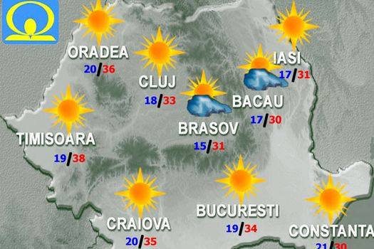 Temperaturile maxime vor fi cuprinse între 28 şi 38 de grade, cu cele mai ridicate valori în Banat, iar cele minime se vor situa între 11 grade în depresiuni şi 25 de grade în Dealurile de Vest.