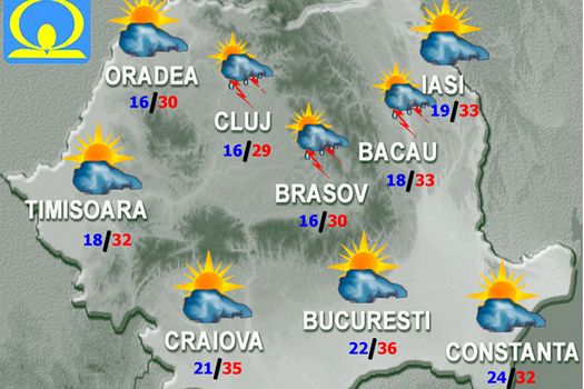 Luni, vremea va fi caniculară după-amiaza, iar temperatura maximă se va situa în jurul valori de 36 de grade. Indicele temperatură-umezeală (ITU) va depăşi pragul critic de 80 de unităţi. Cerul va fi variabil, cu înnorări spre seară şi noaptea când vor fi condiţii pentru averse, descărcări electrice şi intensificări de scurtă durată ale vântului. Temperatura minimă va fi de 21…23 de grade.