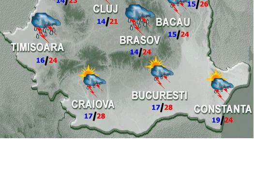 Joi, vremea va fi în general instabilă. Mai ales ziua şi în primele ore ale nopţii, cerul va prezenta înnorări temporar accentuate şi se vor semnala averse însoţite de descărcări electrice în jumătatea de nord a ţării, precum şi în zona de munte şi pe arii restrânse în restul teritoriului. Izolat cantităţile de apă vor fi însemnate şi vor fi condiţii de grindină. Vântul va avea intensificări susţinute în toate regiunile, iar pe crestele montane înalte va sufla tare. Temperaturile maxime vor fi cuprinse între 19 şi 30 de grade, iar cele minime între 5 şi 17 grade, mai ridicate pe litoral.