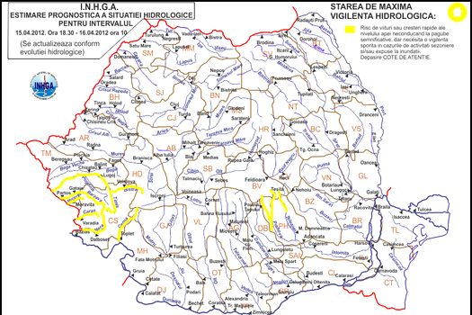 Hidrologii au institutit avertizare de Cod galben pe râurile din bazinele: Timiş – judeţul Caraş Severin, Barzava – judeţul Caraş Severin şi Timiş, Moraviţa – judeţul Timiş, Caraş – judeţul Caraş Severin, Nera – judeţul Caraş Severin, Cerna – judeţul Caraş Severin, bazinul superior al Prahovei şi unii afluenţi ai Buzăului.