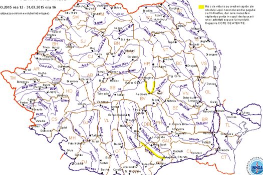 De duminică până luni la prânz au fost sub avertizare cod galben râurile din bazinele hidrografice Teslui, Gemărtălui (judeţele Dolj şi Olt), Beica, Mamu, Pesceana (judeţele Vâlcea şi Olt), Vedea, bazinul superior, din amonte de Văleni, Teleorman, bazinul superior şi mijlociu (judeţele Olt, Argeş şi Teleorman), Neajlov, bazinul superior (judeţul Argeş), Prahova, sectorul din aval de confluenţa cu Teleajen, şi Ialomiţa, în sectorul din aval de confluenţa cu Prahova – Coşereni (judeţele Prahova şi Ialomiţa).