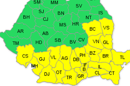 Vineri, între orele 8.00 şi 20.00, vor fi sub cod galben şi judeţele Maramureş, Suceava, Botoşani, Bistriţa-Năsăud, Harghita, Neamţ, Iaşi, Braşov şi Covasna. Tot de vineri, începând cu ora 8.00, vor ieşi de sub atenţionare judeţele Caraş-Severin, Mehedinţi, Gorj, Dolj, Olt, Vâlcea, Argeş şi Teleorman.