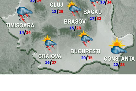 Valorile termice vor marca o scădere uşoară faţă de ziua precedentă şi în regiunile estice şi sud-estice, însă vremea va fi local călduroasă în Oltenia, Muntenia, Dobrogea şi sudul Moldovei. Temperaturile maxime se vor încadra, în general, între 25 şi 33 de grade, iar cele minime între 10 grade în depresiunile Carpaţilor Orientali şi 22 de grade pe litoral. Cerul va fi variabil, cu înnorări temporar accentuate, ziua în regiunile nordice şi nord-estice şi în zonele de munte, iar noaptea şi în rest, unde local vor fi averse, descărcări electrice şi intensificări de scurtă durată ale vântului. Pe suprafeţe mici vor fi căderi de grindină şi cantităţi de apă mai însemnate.