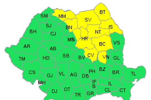 Administraţia Naţională de Meteorologie a actualizat avertizarea emisă miercuri, 11 judeţe din cele 24 avertizare anterior rămânând sub cod galben până vineri, la ora 23.00, respectiv Botoşani, Iaşi, Suceava, Neamţ, Bacău, Vrancea, Covasna, Harghita, Mureş, Bistriţa-Năsăud şi Maramureş.