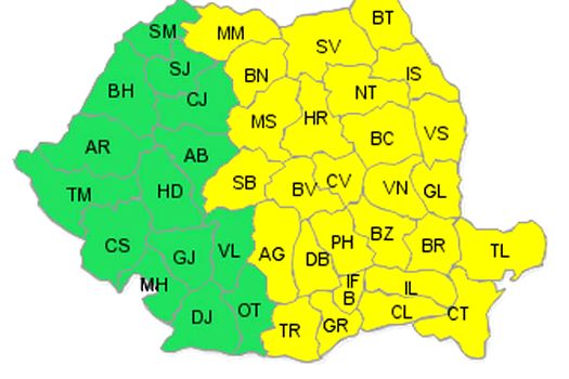 Judeţele care de joi până sâmbătă dimineaţă vor fi sub avertizarea cod galben de ploi şi vijelii sunt Teleorman, Giurgiu, Călăraşi, Dâmboviţa, Ilfov, Ialomiţa, Constanţa, Brăila, Tulcea, Prahova, Buzău, Argeş, Vâlcea, Braşov, Covasna, Sibiu, Mureş, Harghita, Bistriţa-Năsăud, Maramureş, Galaţi, Vrancea, Bacău, Vaslui, Neamţ, Suceava şi Botoşani, precum şi municipiul Bucureşti.