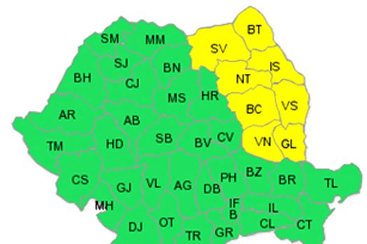 Codul galben a fost emis pentru judeţele Suceava, Botoşani, Iaşi, Neamţ, Bacău, Vaslui, Galaţi şi Vrancea.