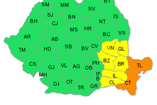 În cazul judeţelor Brăila, Buzău, Vrancea, Galaţi, Ialomiţa şi Călăraşi a fost emis cod galben până vineri la ora 12.00.