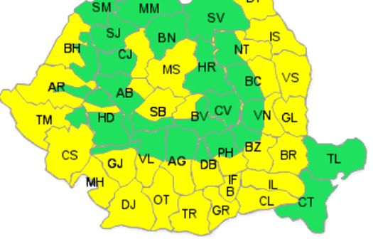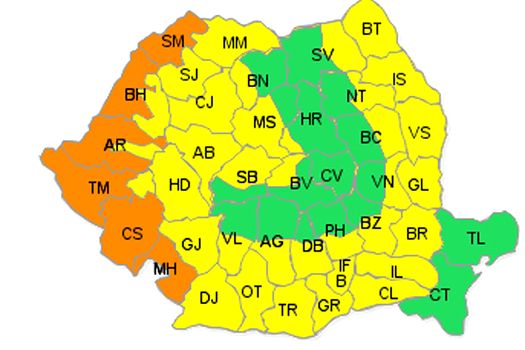 Pentru vineri, 24 iulie, se menţine o avertizare cod galben de caniculă pentru cea mai mare parte a ţării, mai ales în zonele de câmpie şi podiş, unde şi indicele temperatură-umezeală (ITU) va depăşi pragul critic de 80 de unităţi. Temperaturile maxime vor atinge frecvent 35…37 de grade şi izolat 38 de grade.